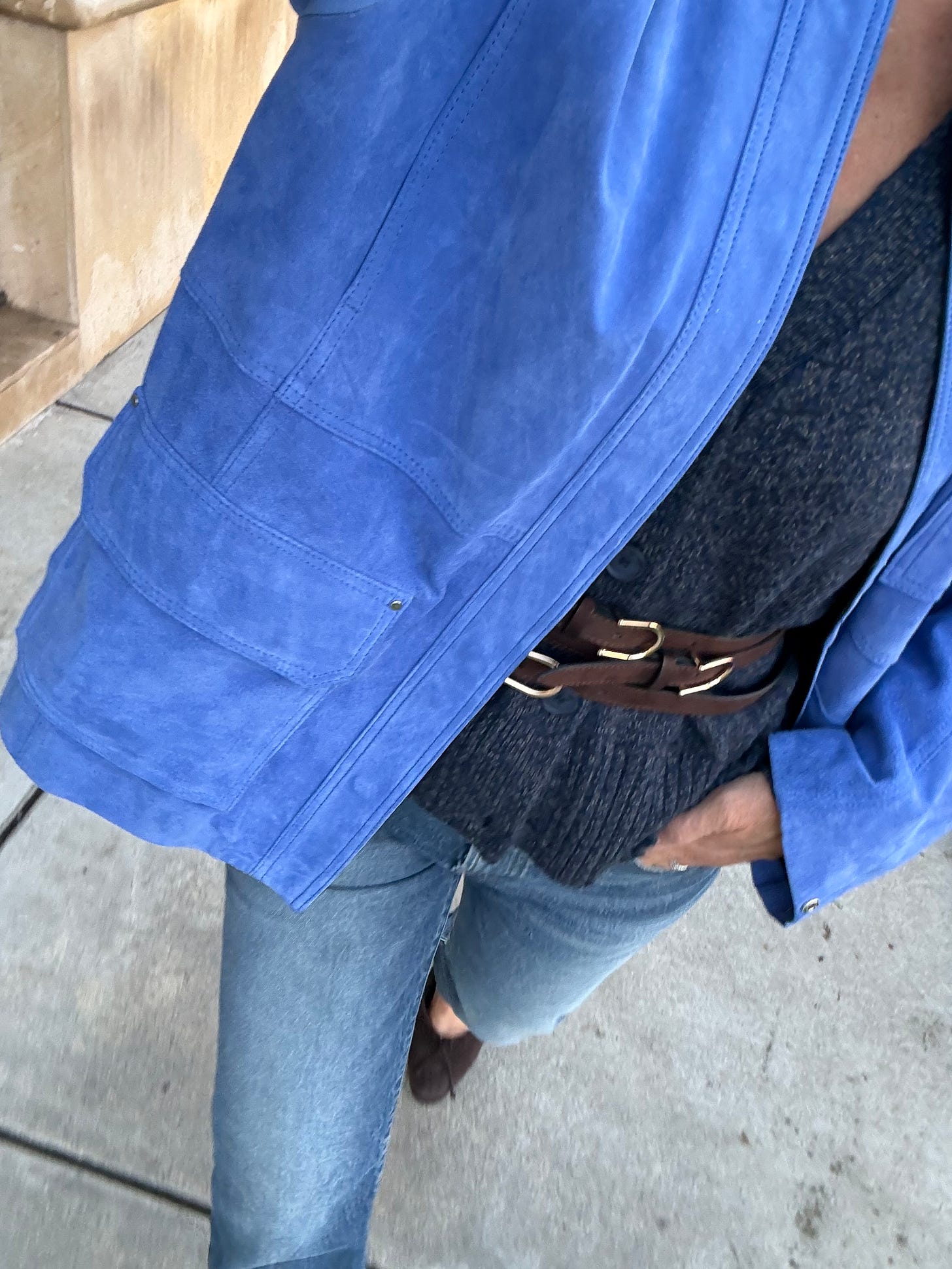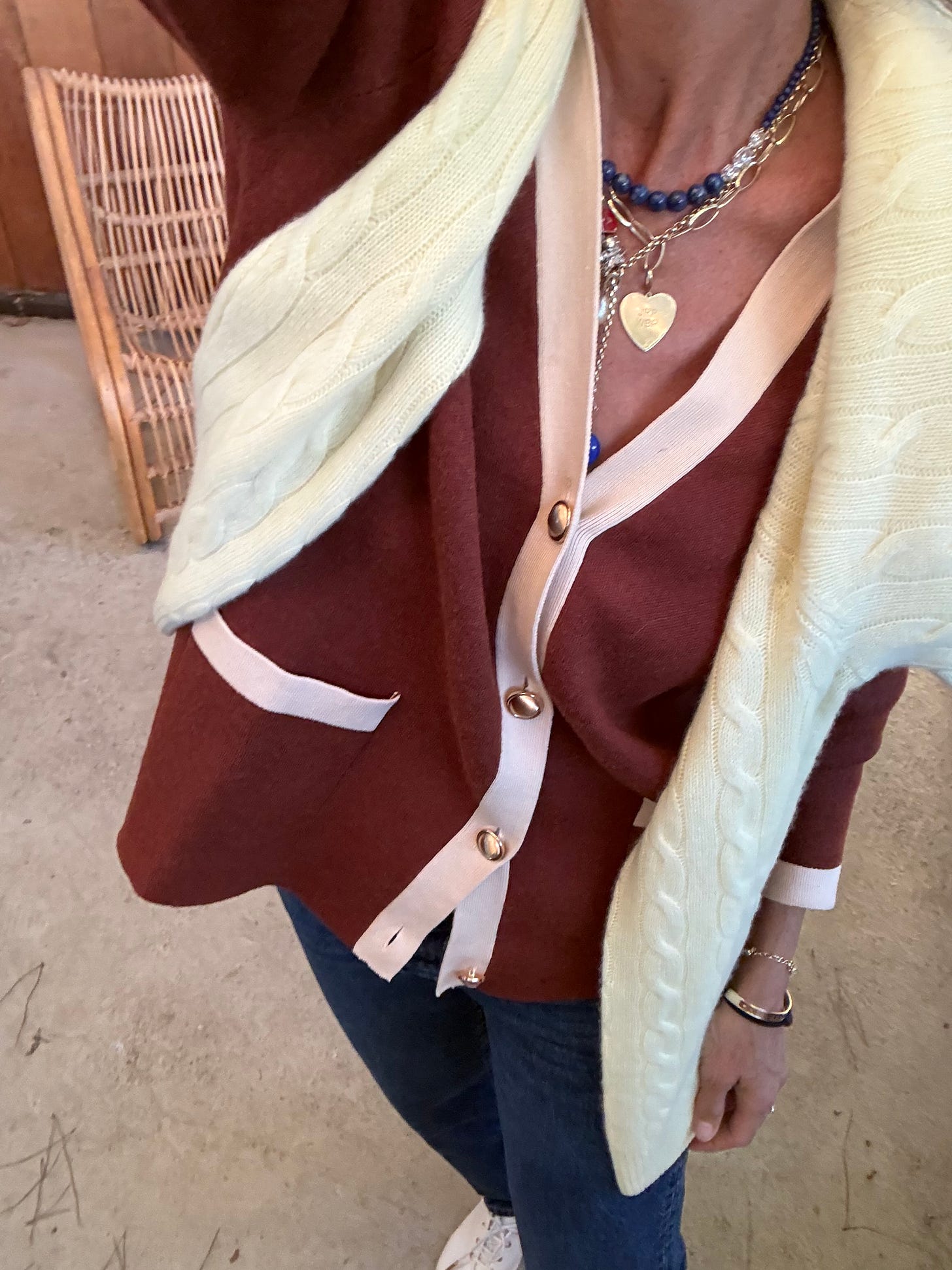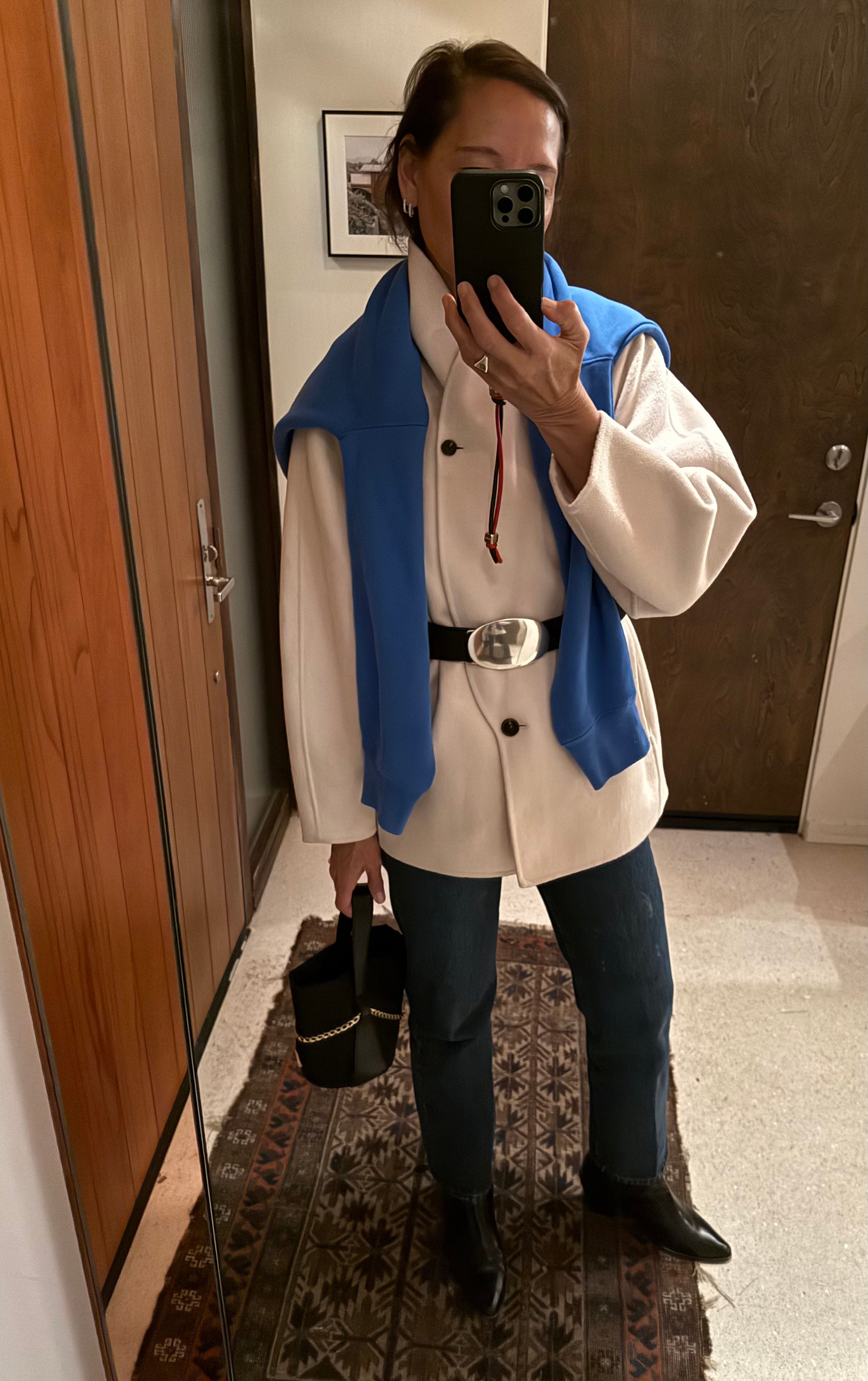 And maybe it’s about self-expression. Not the kind that announces itself across a room, but the kind that lives in my fridge, my bathroom cabinet, or even around my waist (three times over below), in my ears or on my neck (above). The thrill of knowing I have the good chocolate hidden behind the almond butter. The confidence of using a cleanser that feels slightly aspirational. The relief of simply throwing on a cardigan (Heidi Merrick, above, Kule, below) and appearing “dressed.”